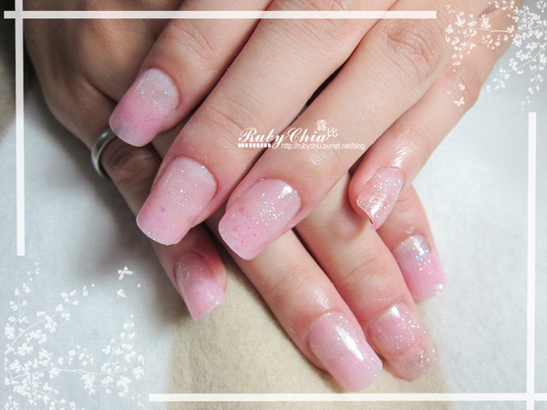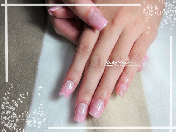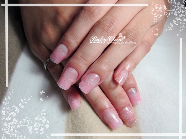除了邊邊有角角裂掉外,維持的超好。 因為長長很多,她想要換新的顏色,一樣要低調!所以選了二個透色的粉紅來做。