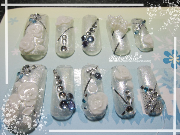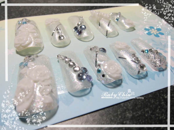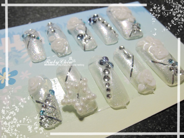 這附甲片跟之前hello kitty的甲片是同一個新娘訂的喔!白色這款我設計的比較典雅,用白色是最百搭的款式,白紗啊!