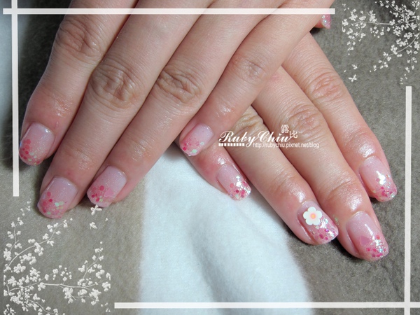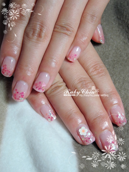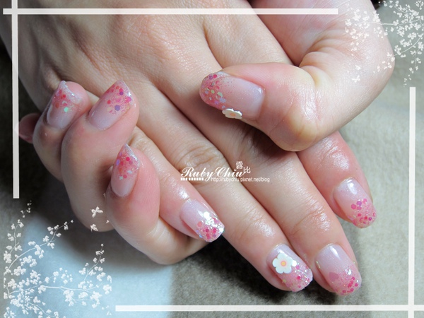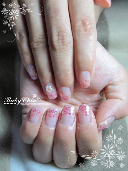 先用了自然粉做出健康指甲的效果,再用透色的銀色璀璨刷出淡淡的銀色漸層,最後再用粉色的亮片刷出粉嫩的漸層色。