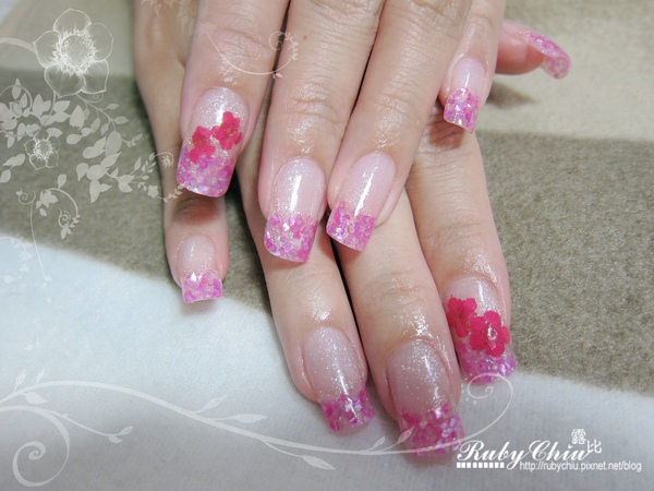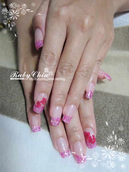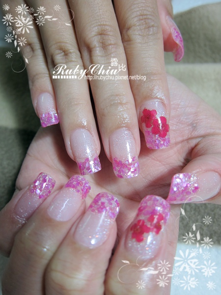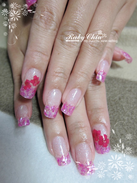 然後不是啦~ 我不只買三種顏色! 最後李同學挑了桃紅色的貝殼,跟粉色的璀璨粉來夾心,食指的部份還多夾了小花。