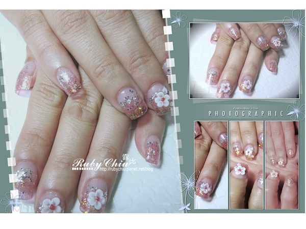 再加上要低調點,所以選用透粉色的璀璨粉,本來想把ivy彩繪,結果..一直不滿意,就雕了3朵五瓣花,典雅簡單。
