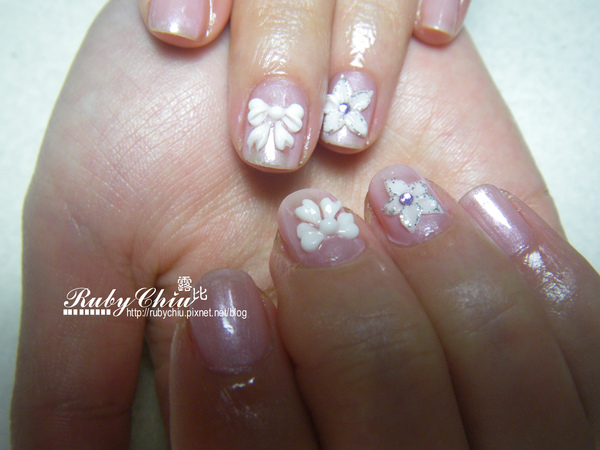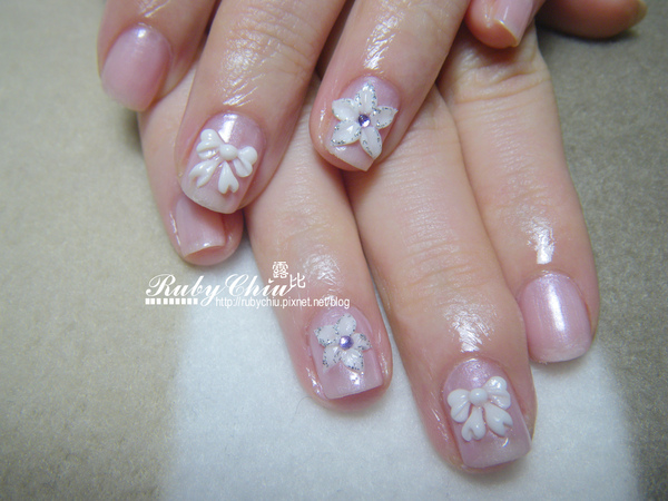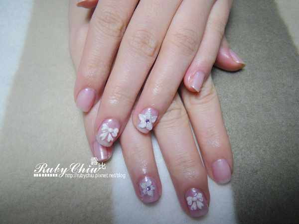 用了OPI B72,很淡又有點透的粉紅,再加上五瓣雕花跟蝴蝶結點綴,優雅極了。