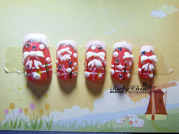 再用壓克力水彩於下方畫出方格,接下來就雕可愛的蝴蝶結粉雕囉! 最後再加上一些水鑽裝飾!!! 就完成囉!