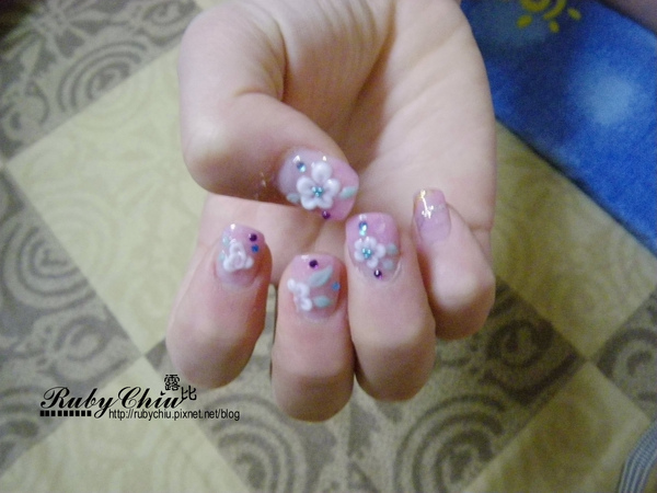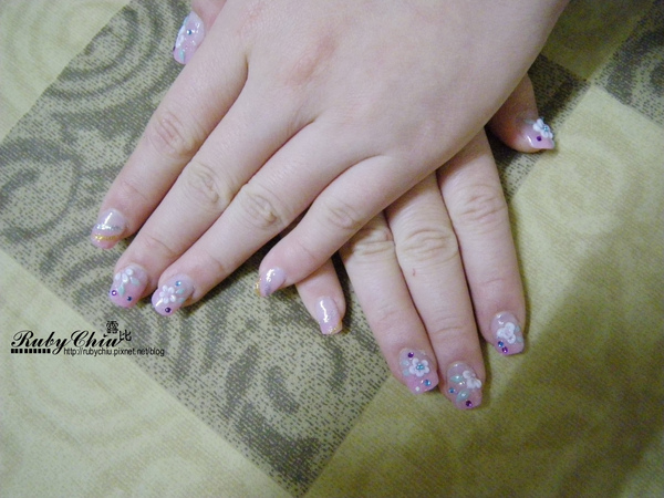 堂妹喜歡粉色,於是我就用了粉色璀璨粉來做,當然不外乎就是粉雕加鑽的練習啦!